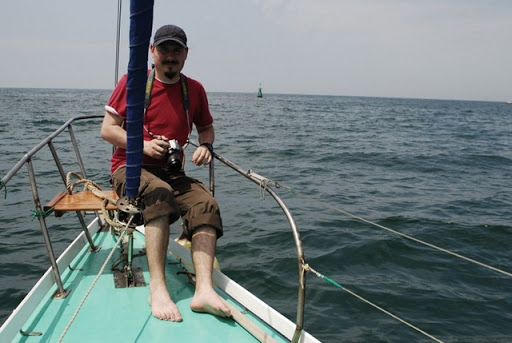 По набережной ходили толпы пионеров в разноцветных галстуках. Было жарко, но не пекло. Разные люди предлагали морские прогулки на катерах, но мы лениво отказывались. И в один момент среди самодельных лодок и катеров мы увидели парусник. Одномачтовая маленькая лодка. Я говорю Танюшке: "если уж выходить в море, то на такой штуке, под парусом!" Тут же сзади образовалась женщина, предложвшая нам прокатиться на паруснике до Херсонеса и обратно, ещё и искупавшись на ходу в открытом море! Мы без раздумий согласились и залезли на борт. Переоделись внутри судёнышка, взяти фото и стали наблюдать народ на набережной уже с моря.